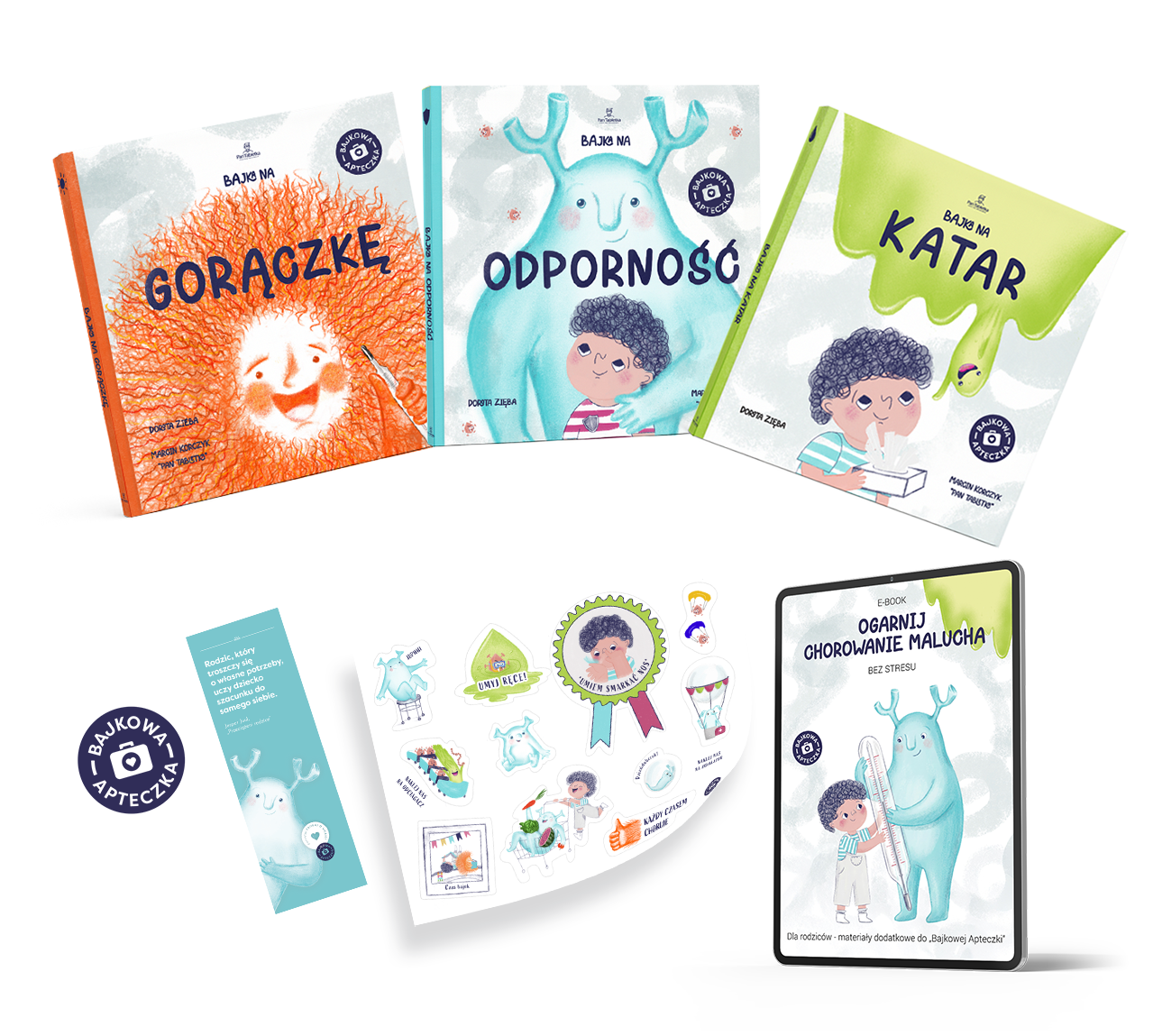 „Bajki na Katar, na Gorączkę i na Odporność” – to 3 książeczki opowiadające o reakcjach naszych organizmów na infekcje. Każda z nich to ponad 30 stron wypełnionych przygodami WYJĄTKOWYCH bohaterów i oryginalnymi metaforami Marcina Korczyka (Pana Tabletki) oraz kolorowymi, ciepłymi ilustracjami Doroty Zięby (której kreskę możesz znać z innych książek Pana Tabletki).